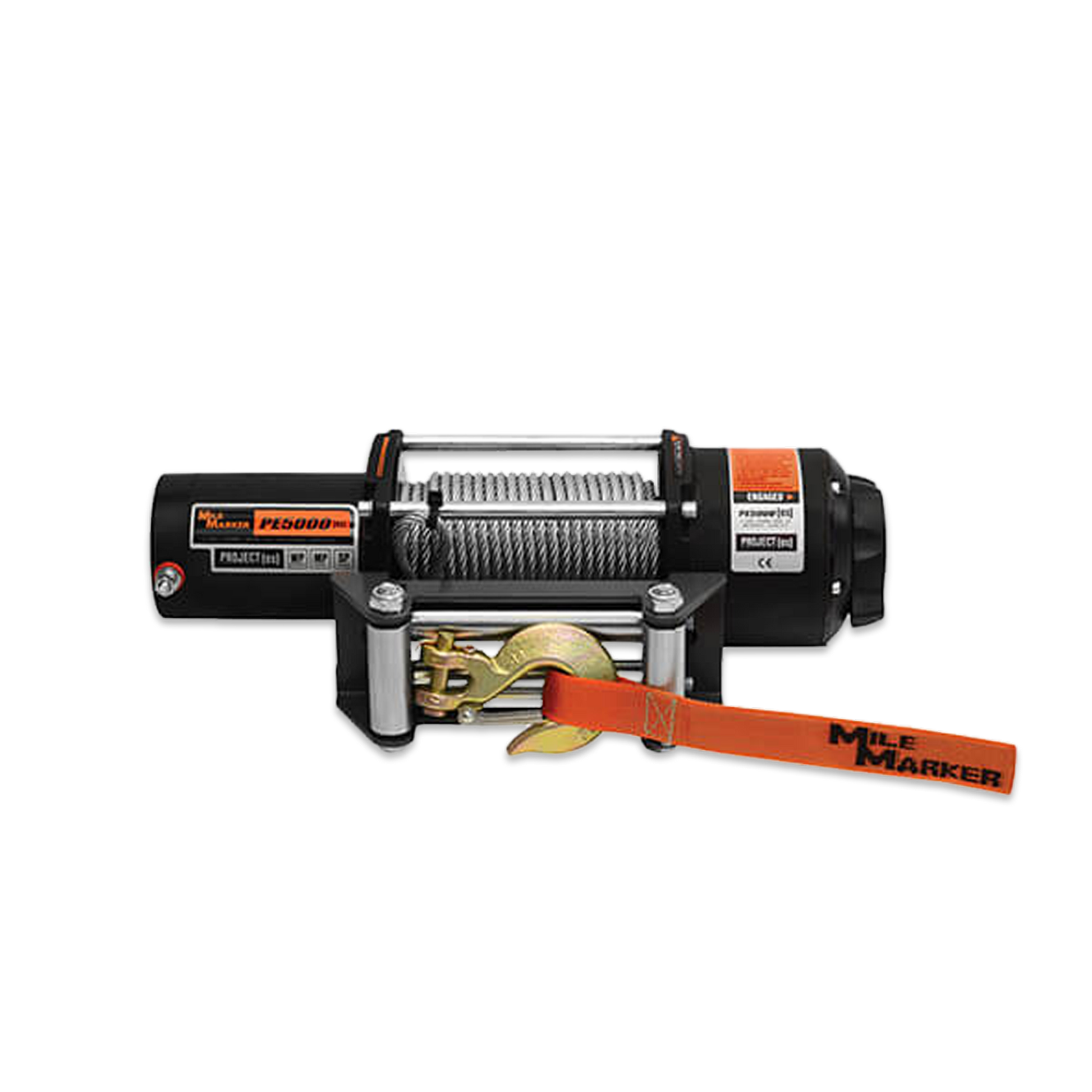 Fully-sealed, submersible, water, mud, and snow proof, the PE5000 Steel Cable Version comes with a 1/4” x 79’ steel cable, a galvanized roller fairlead, the Synthetic Rope version comes with a 1/4” x 50’ synthetic rope, an anodized aluminum hawse fairlead, a hook, corrosive-resistant, and a handheld remote control for versatility and convenience.
