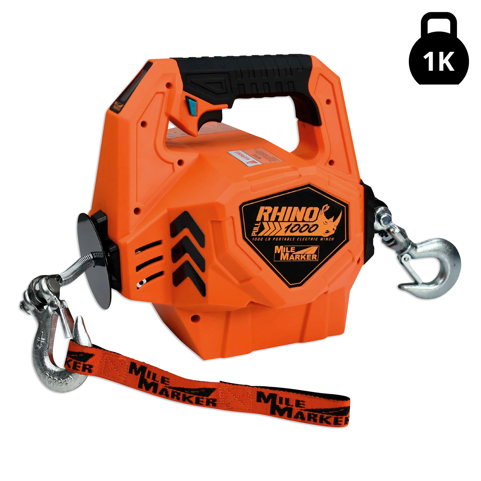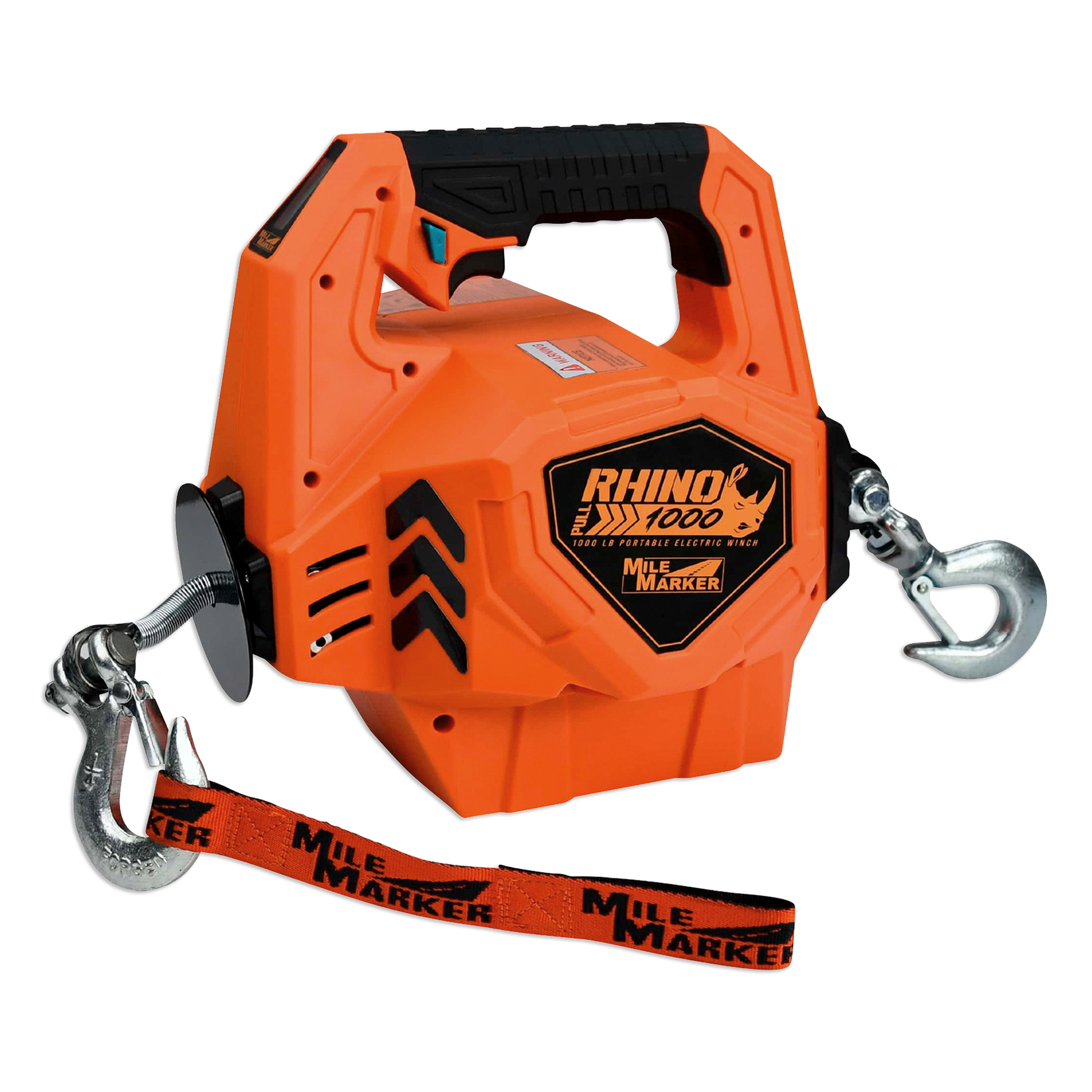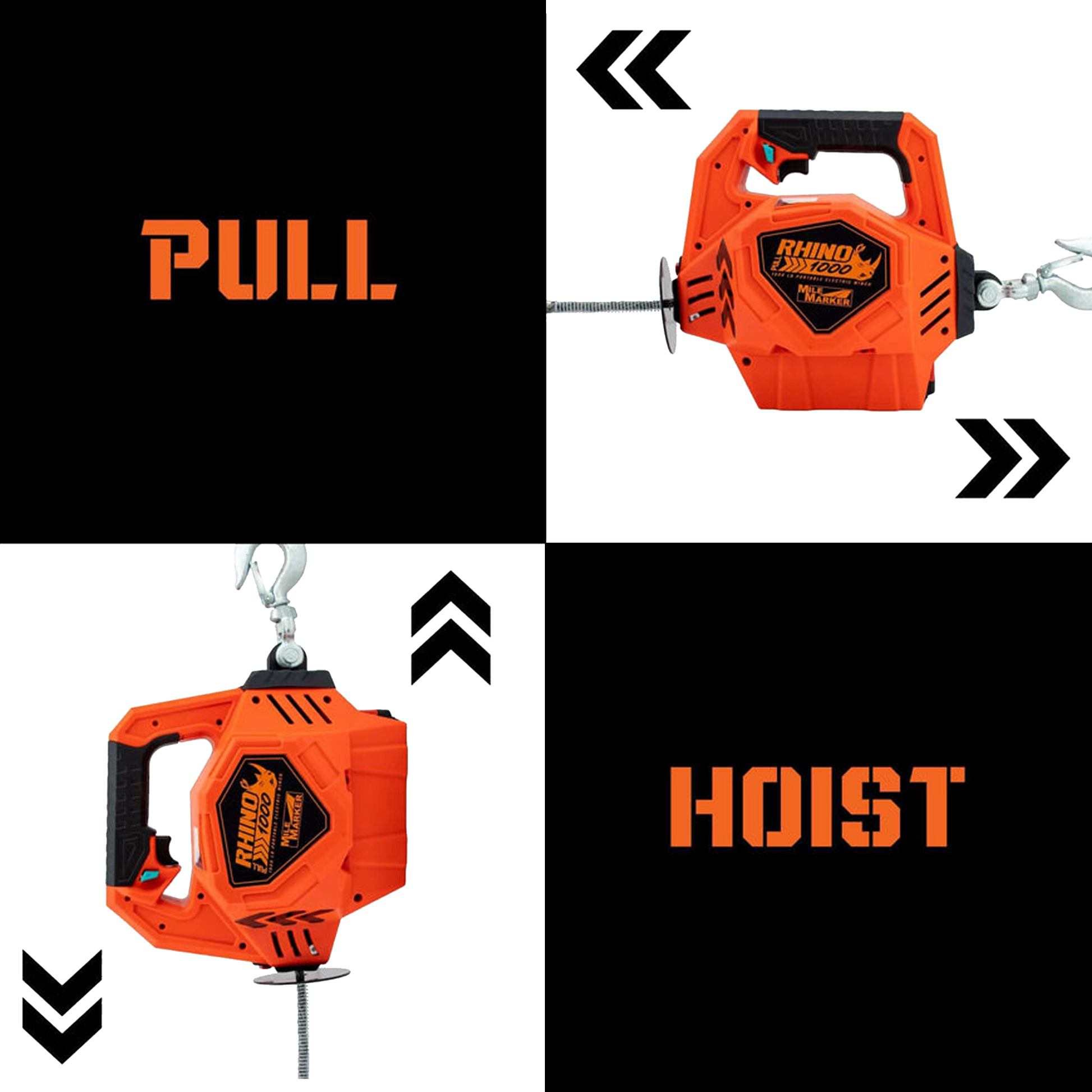 The RHINO PULL 1000™ will give you the power to pull items anywhere you need it, including the garage, workshop, or the farm. This portable winch can even go with you if you are hunting. This ergonomically designed tool features 39’ of synthetic rope, a variable speed hand controller, a wireless control that can work up to 50’, and a corded remote if the wireless remote battery is not maintained.